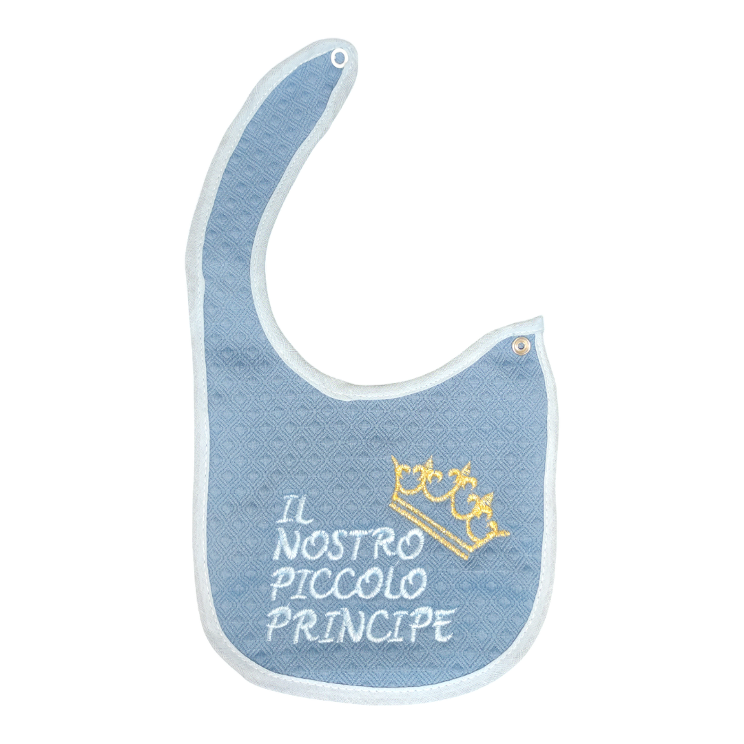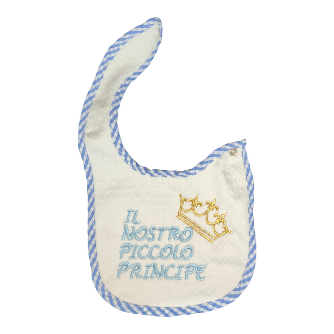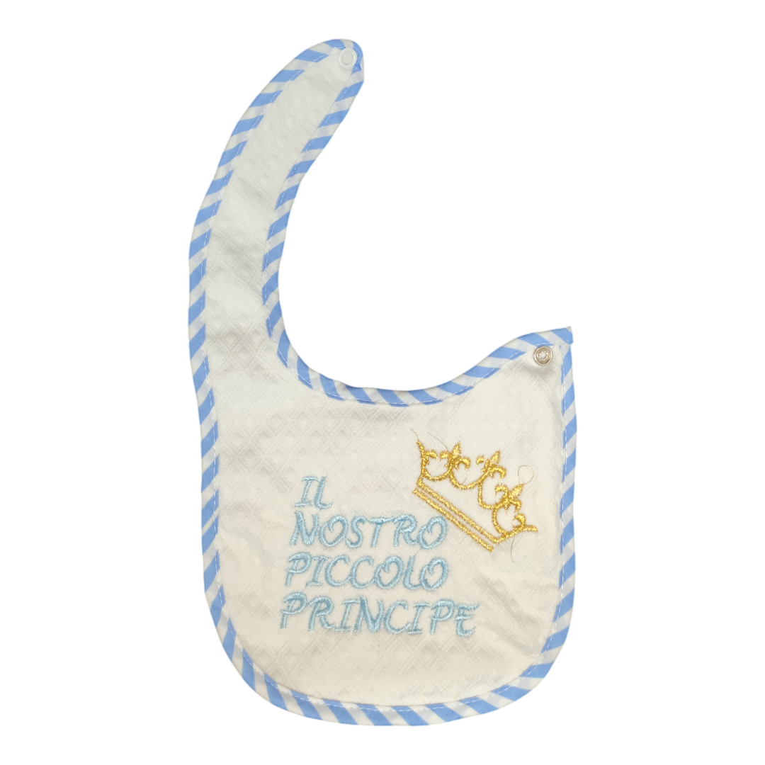 Elegante bavaglino realizzato in morbido tessuto di alta qualità, perfetto per il comfort del tuo bambino. Rifinito con un delicato bordo a righe, presenta un raffinato ricamo con la scritta “Il nostro piccolo principe” e una corona decorativa. Dotato di pratica chiusura a bottone, è ideale per proteggere i vestiti del tuo piccolo con stile e praticità.