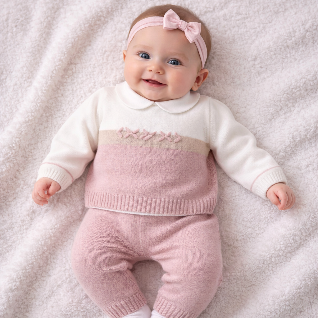 Un elegante completo primaverile in maglia di cotone, perfetto per le giornate più fresche della stagione. La maglia, impreziosita da una delicata lavorazione a trecce, presenta un raffinato colletto bianco per un tocco classico e sofisticato. Il pantalone elasticizzato assicura il massimo comfort e libertà di movimento per il tuo bambino.