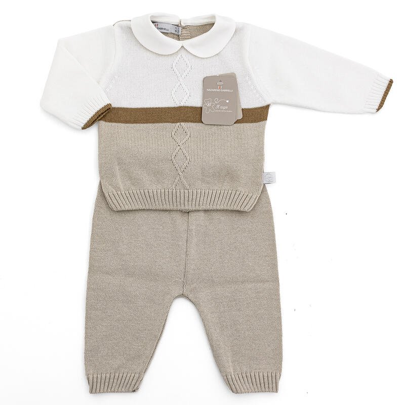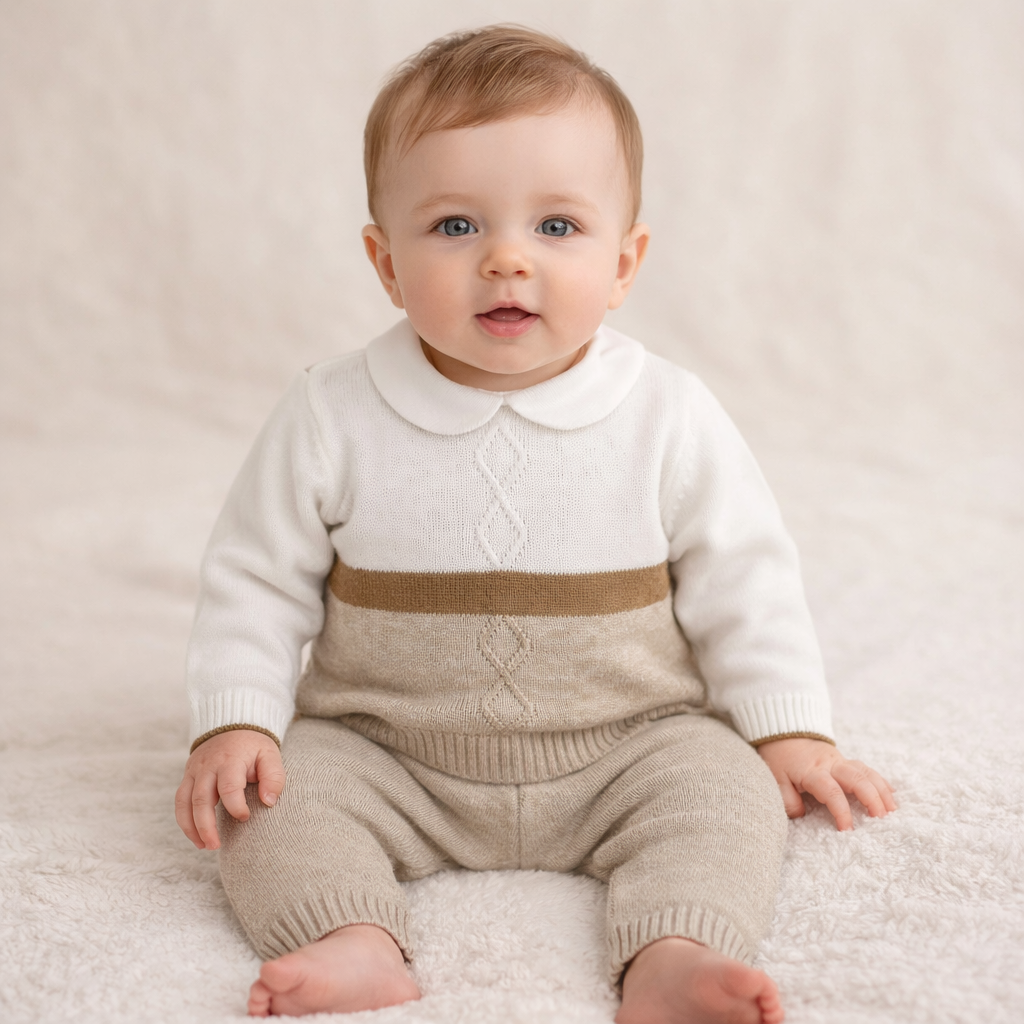 Un elegante completo primaverile in maglia di cotone, perfetto per le giornate più fresche della stagione. La maglia, impreziosita da una delicata lavorazione a trecce, presenta un raffinato colletto bianco per un tocco classico e sofisticato. Il pantalone elasticizzato assicura il massimo comfort e libertà di movimento per il tuo bambino.