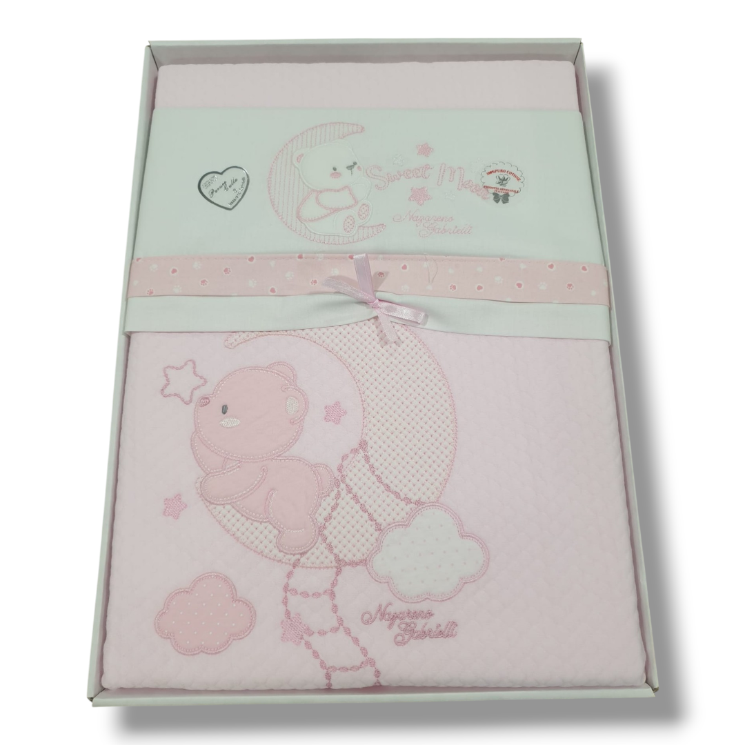 Coordinato per la culletta e carrozzina, composto da Copertina  in cotone rombino con un grazioso orsacchiotto ricamato sia sulla copertina che sulla balza del lenzuolo. La federina del lenzuolo ha il bordo laterale con fascia in puro cotone piquet.  Sotto lenzuolo in tinta unita.