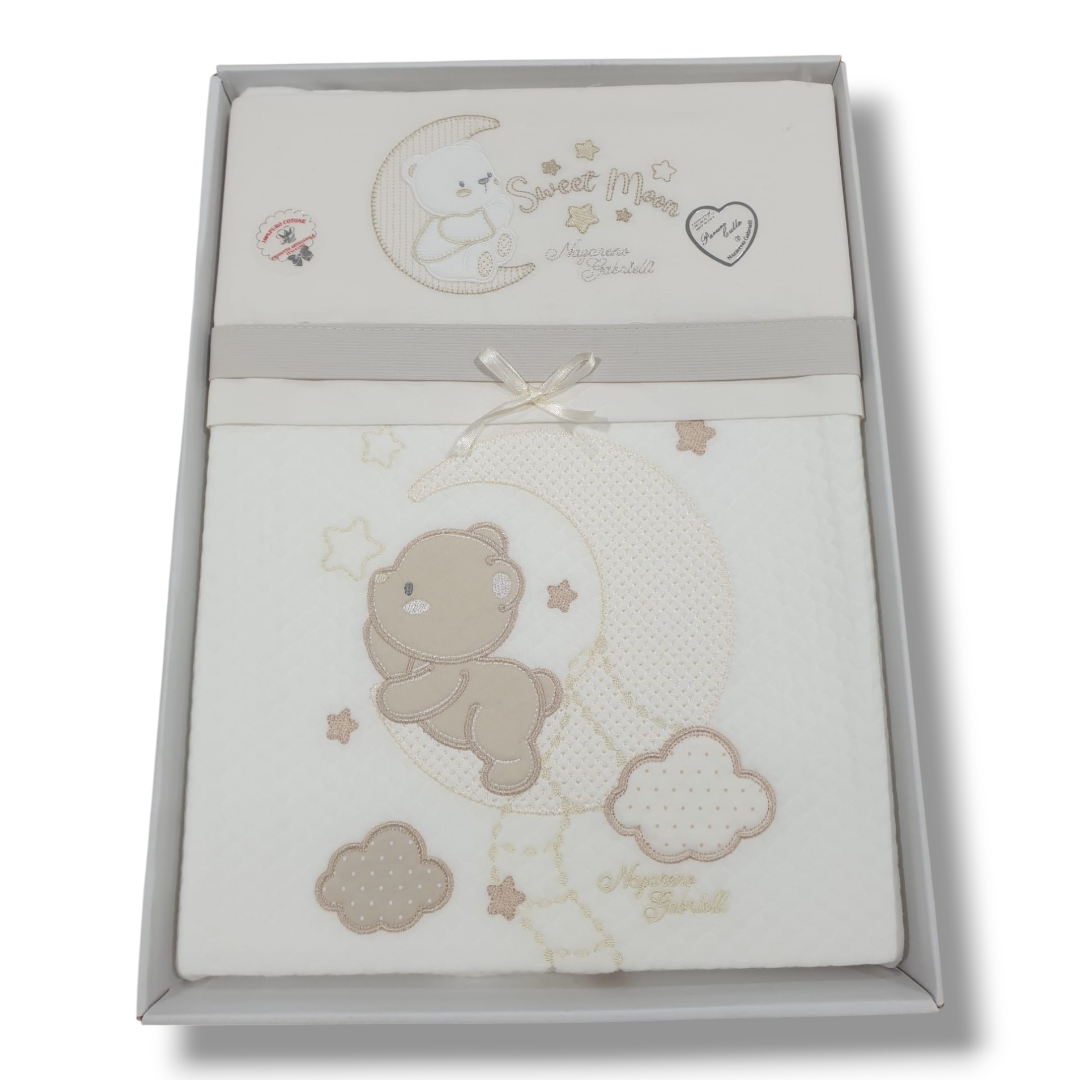Coordinato per la culletta e carrozzina, composto da Copertina in cotone rombino con un grazioso orsacchiotto ricamato sia sulla copertina che sulla balza del lenzuolo. La federina del lenzuolo ha il bordo laterale con fascia in puro cotone piquet. Sotto lenzuolo in tinta unita.