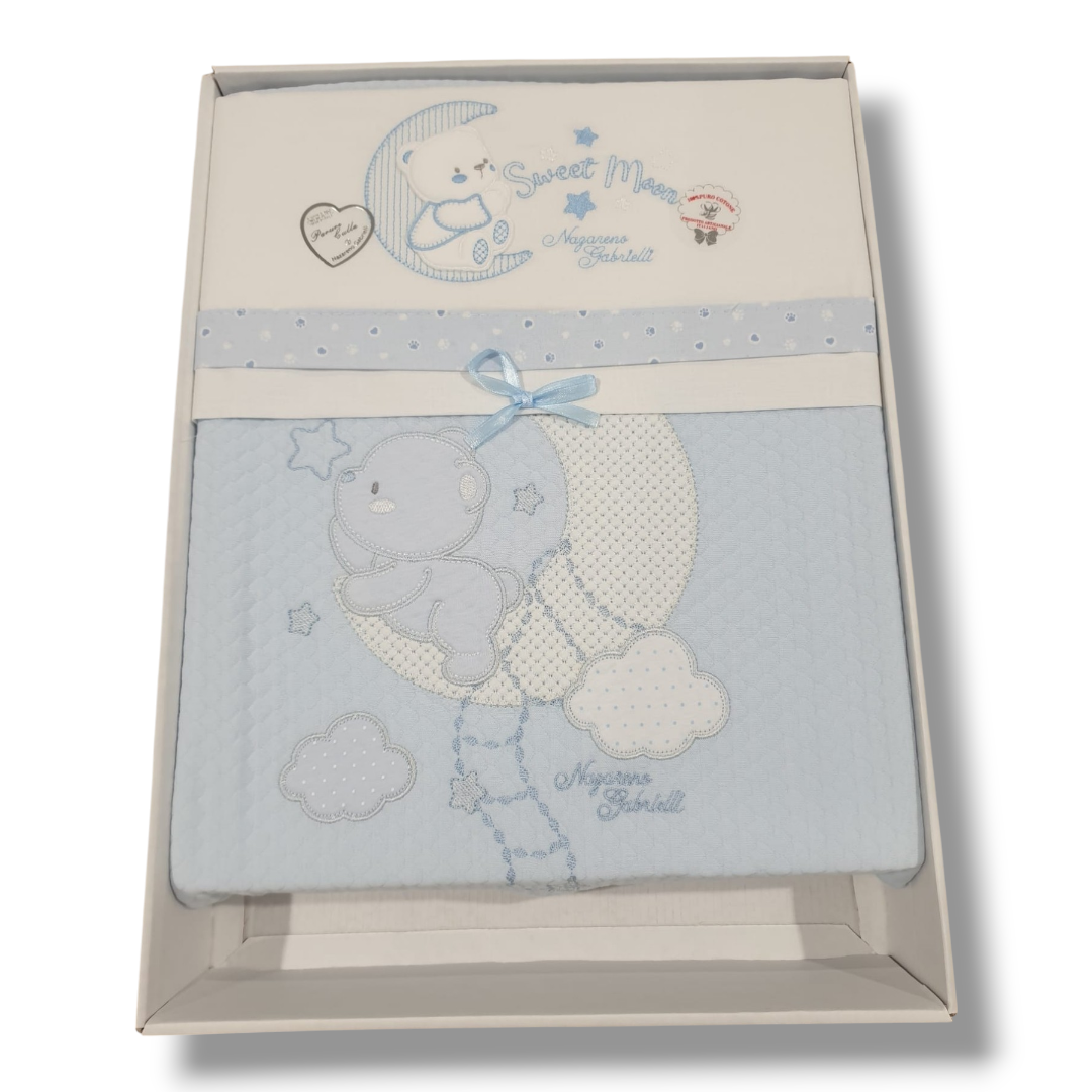 Coordinato per la culletta e carrozzina, composto da Copertina in cotone rombino con un grazioso orsacchiotto ricamato sia sulla copertina che sulla balza del lenzuolo. La federina del lenzuolo ha il bordo laterale con fascia in puro cotone piquet. Sotto lenzuolo in tinta unita.