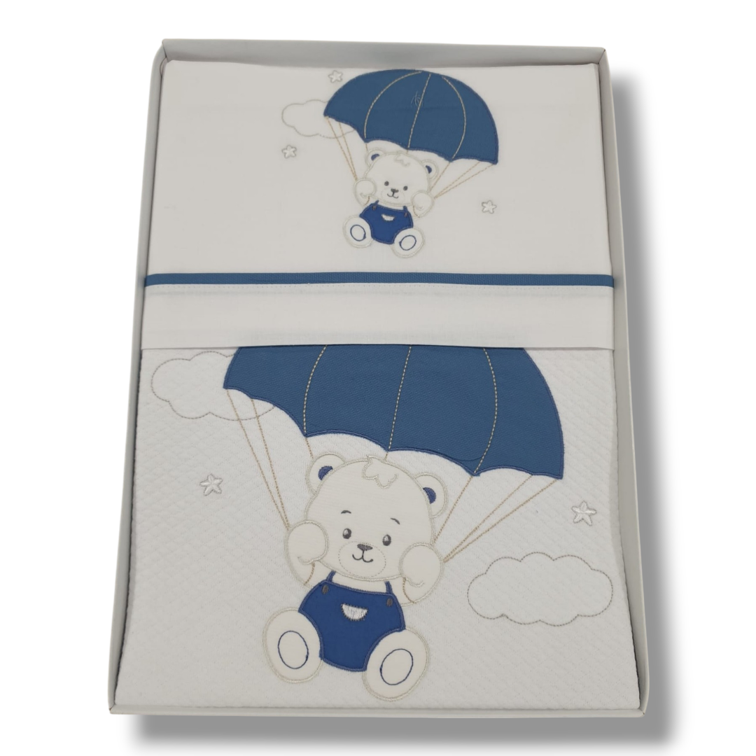 Coordinato per la culletta e carrozzina, composto da Copertina  in cotone rombino con un grazioso orsacchiotto ricamato sia sulla copertina che sulla balza del lenzuolo.