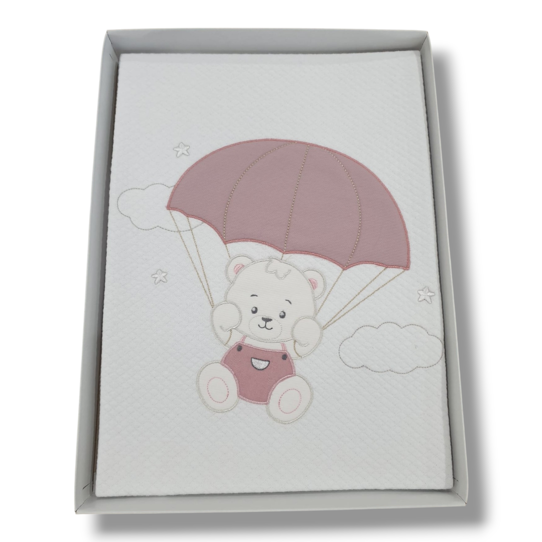 Copertina per la culletta e carrozzina, composto da Copertina in cotone rombino con un grazioso orsacchiotto ricamato sia sulla copertina.