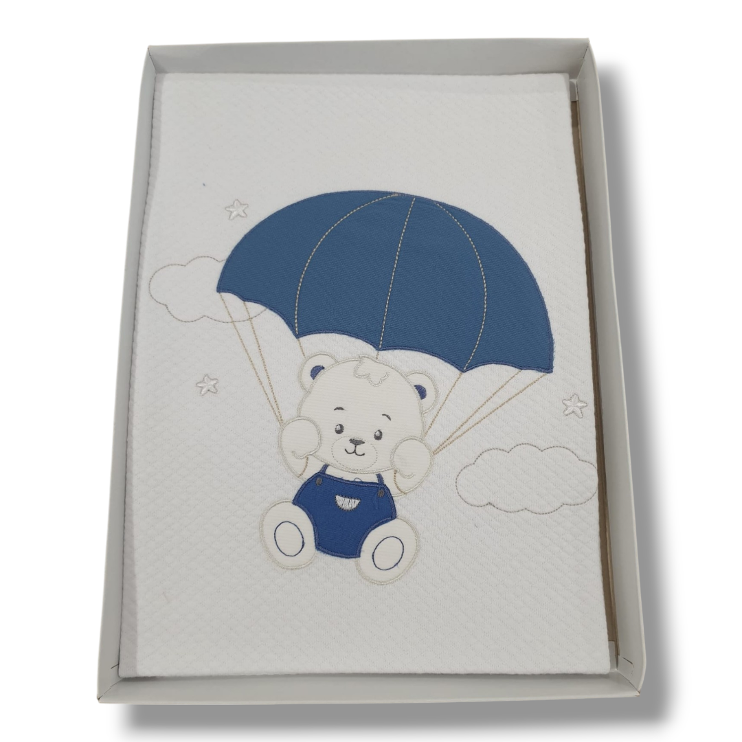 Copertina per la culletta e carrozzina, composto da Copertina in cotone rombino con un grazioso orsacchiotto ricamato sia sulla copertina.