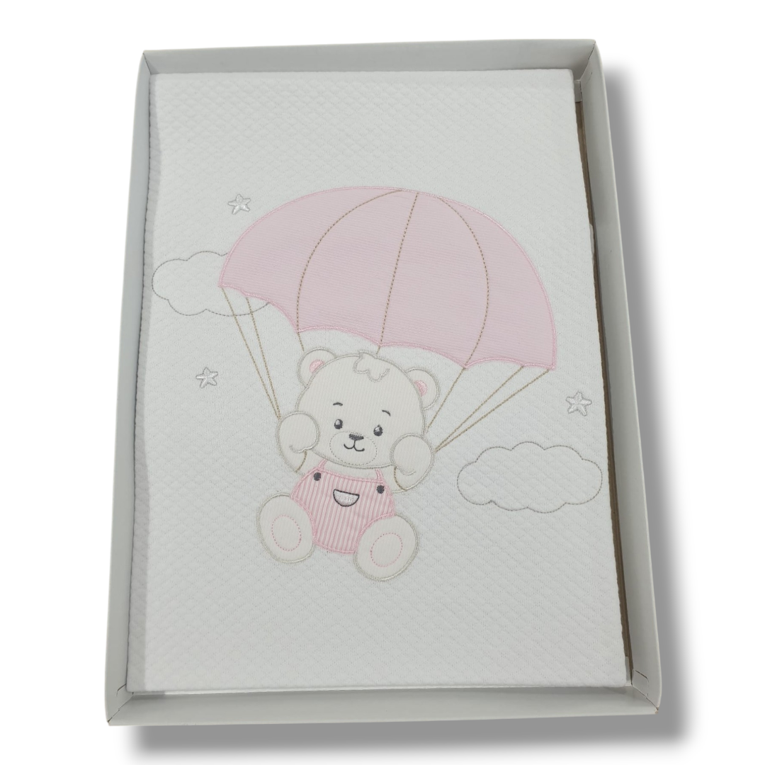 Copertina per la culletta e carrozzina, composto da Copertina in cotone rombino con un grazioso orsacchiotto ricamato sia sulla copertina.