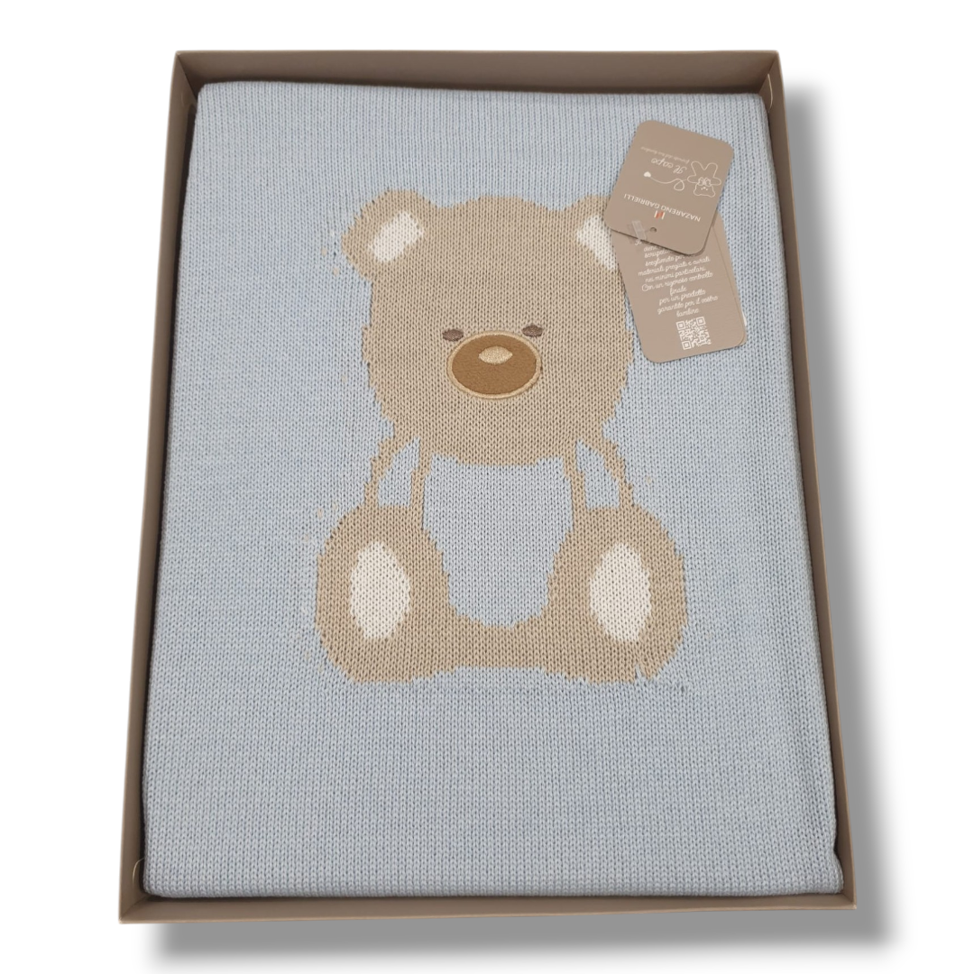 Caratterizzata da una lavorazione a maglia fine e un delicato disegno fantasia con un adorabile orsetto ricamato al centro, questa copertina aggiunge un tocco di tenerezza e stile classico al corredo del tuo bambino.