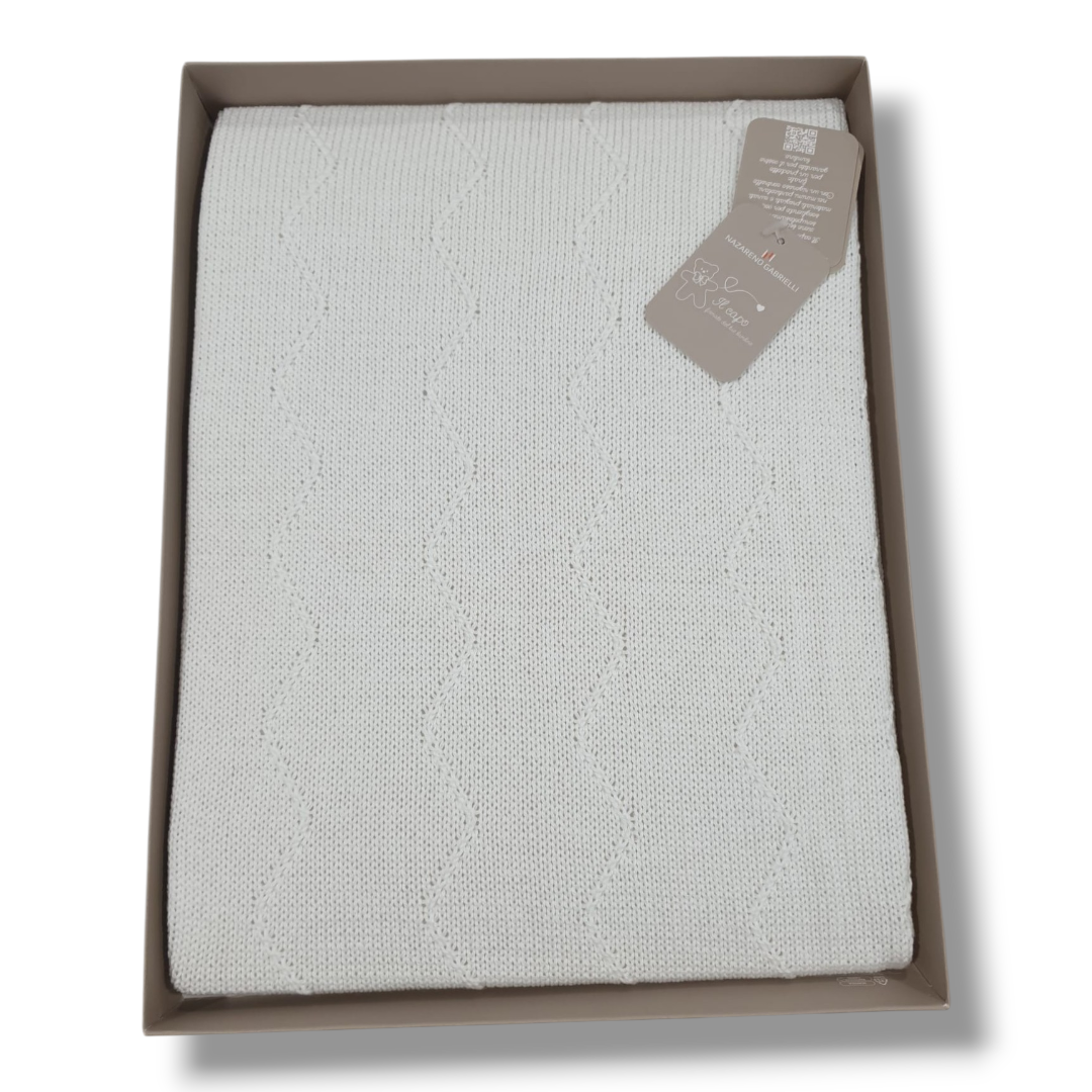 Avvolgi il tuo bambino in un abbraccio di morbidezza e comfort con questa elegante copertina in filo di puro cotone 100% della rinomata collezione Nazareno Gabrielli. Con la sua classica e raffinata lavorazione a trecce, è l’accessorio indispensabile per il corredino del tuo bebè.