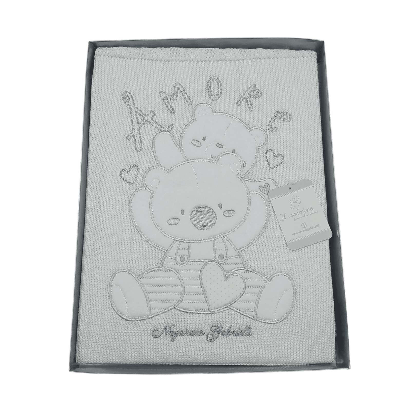Copertina misura culletta e carrozzina realizzata in 100% filo di puro cotone ricamata al centro.