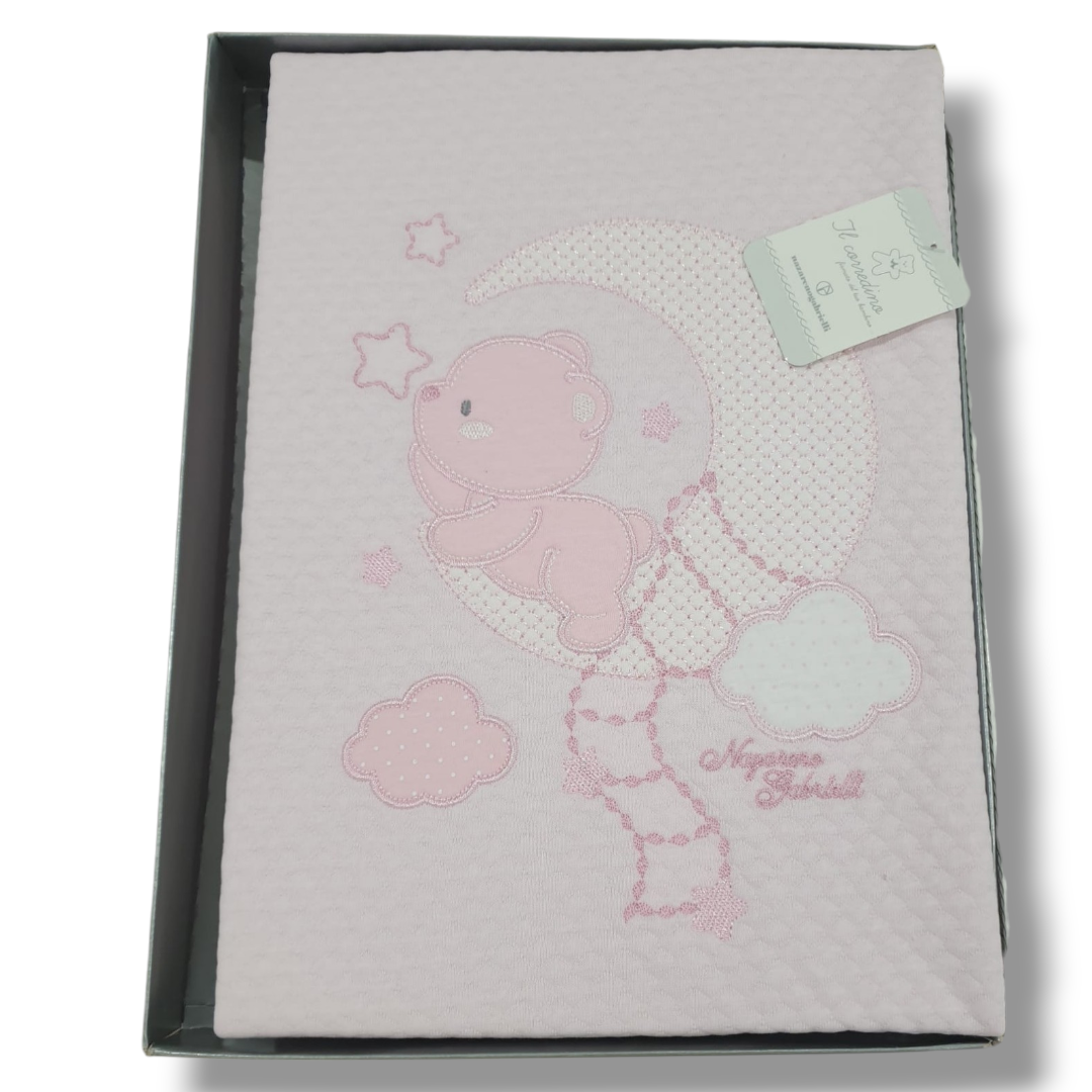 Avvolgi il tuo piccolo in un abbraccio di pura morbidezza con questa deliziosa copertina firmata Nazareno Gabrielli. Realizzata in fresco e traspirante cotone di alta qualità con una delicata lavorazione a rombini, questa coperta è l’ideale per le passeggiate in carrozzina o per la nanna nella culla durante le mezze stagioni.