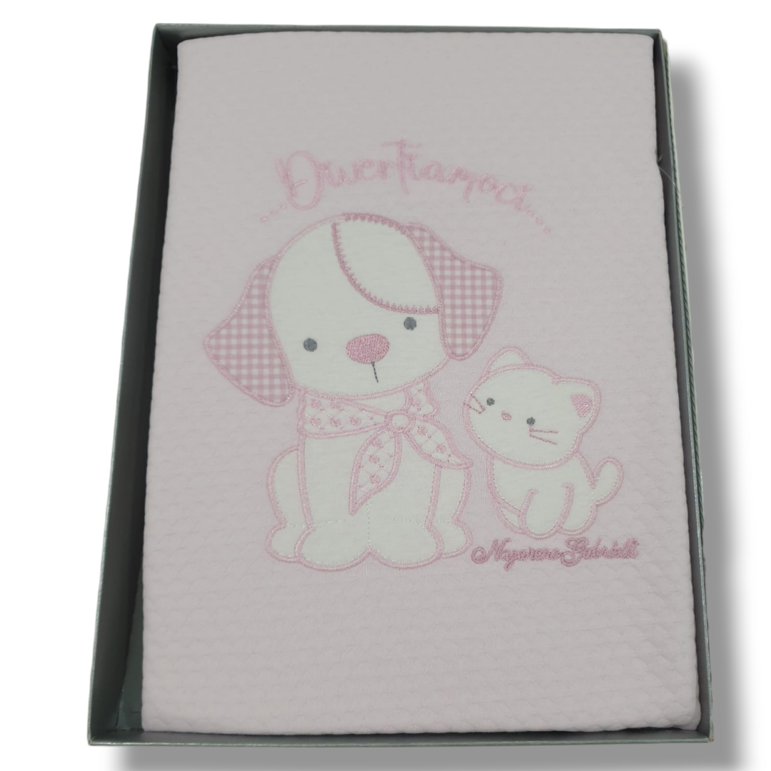 Il suo design elegante presenta un tenero ricamo centrale di un cagnolino e un gattino, che aggiunge un tocco di dolcezza e stile al corredo del neonato. Prodotta con materiali ipoallergenici e curata nei minimi dettagli, è pensata per offrire il massimo comfort e rispettare la pelle sensibile dei più piccoli.