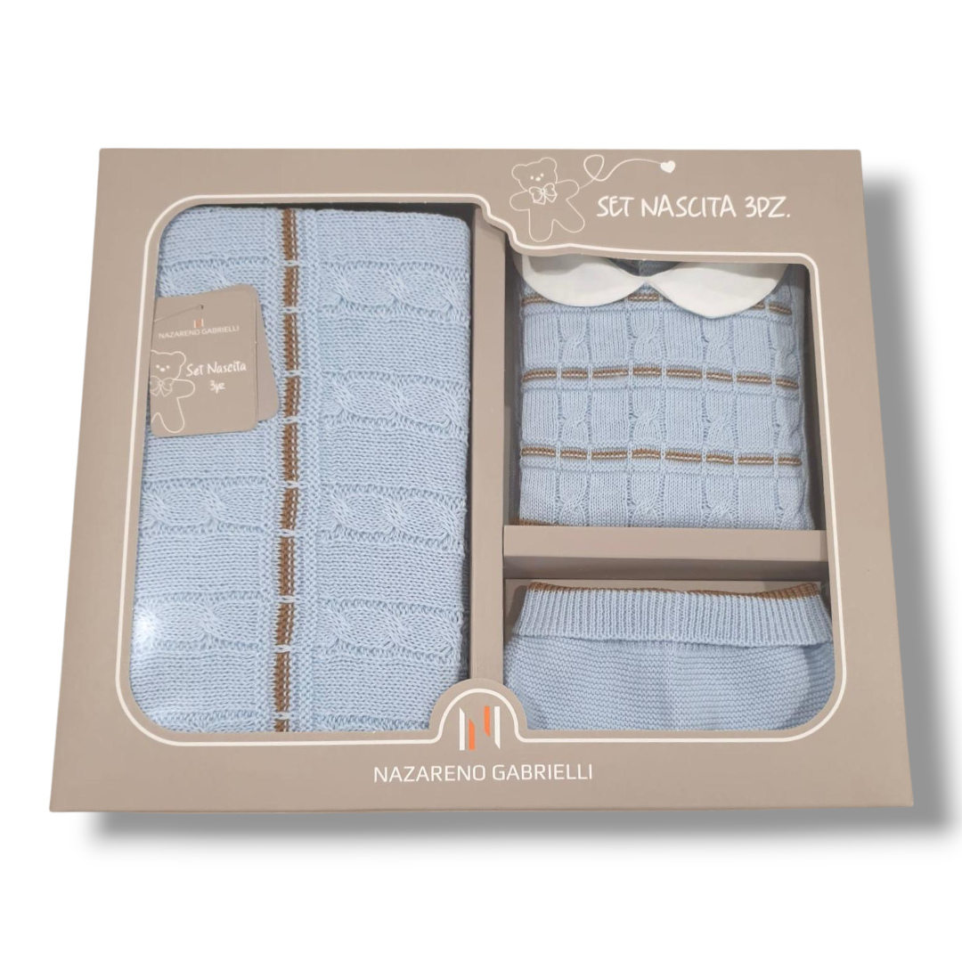 Un elegante coordinato per neonati firmato Nazareno Gabrielli, realizzato in morbido cotone di alta qualità. Perfetto per i primi mesi di vita, questo set include: