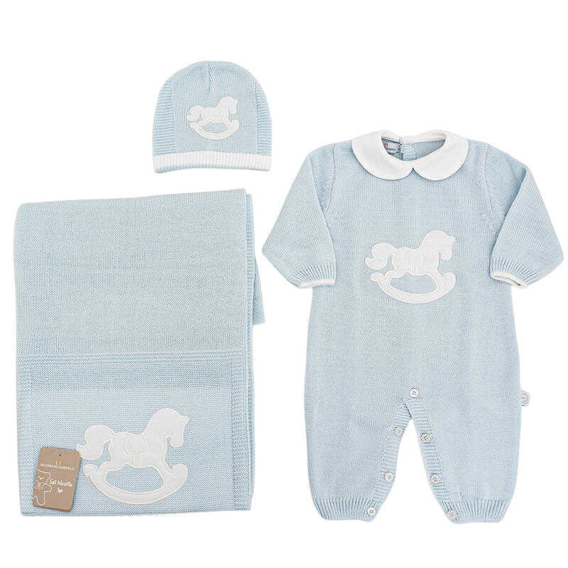Un elegante coordinato per neonati firmato Nazareno Gabrielli, realizzato in morbido misto lana di alta qualità. Perfetto per i primi mesi di vita, questo set include: