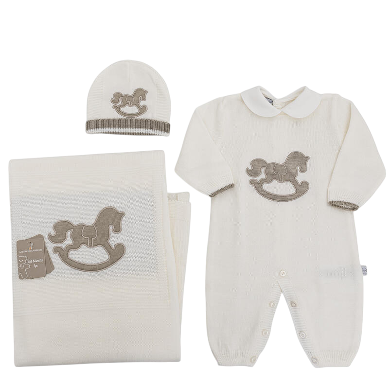 Un elegante coordinato per neonati firmato Nazareno Gabrielli, realizzato in morbido misto lana di alta qualità. Perfetto per i primi mesi di vita, questo set include: